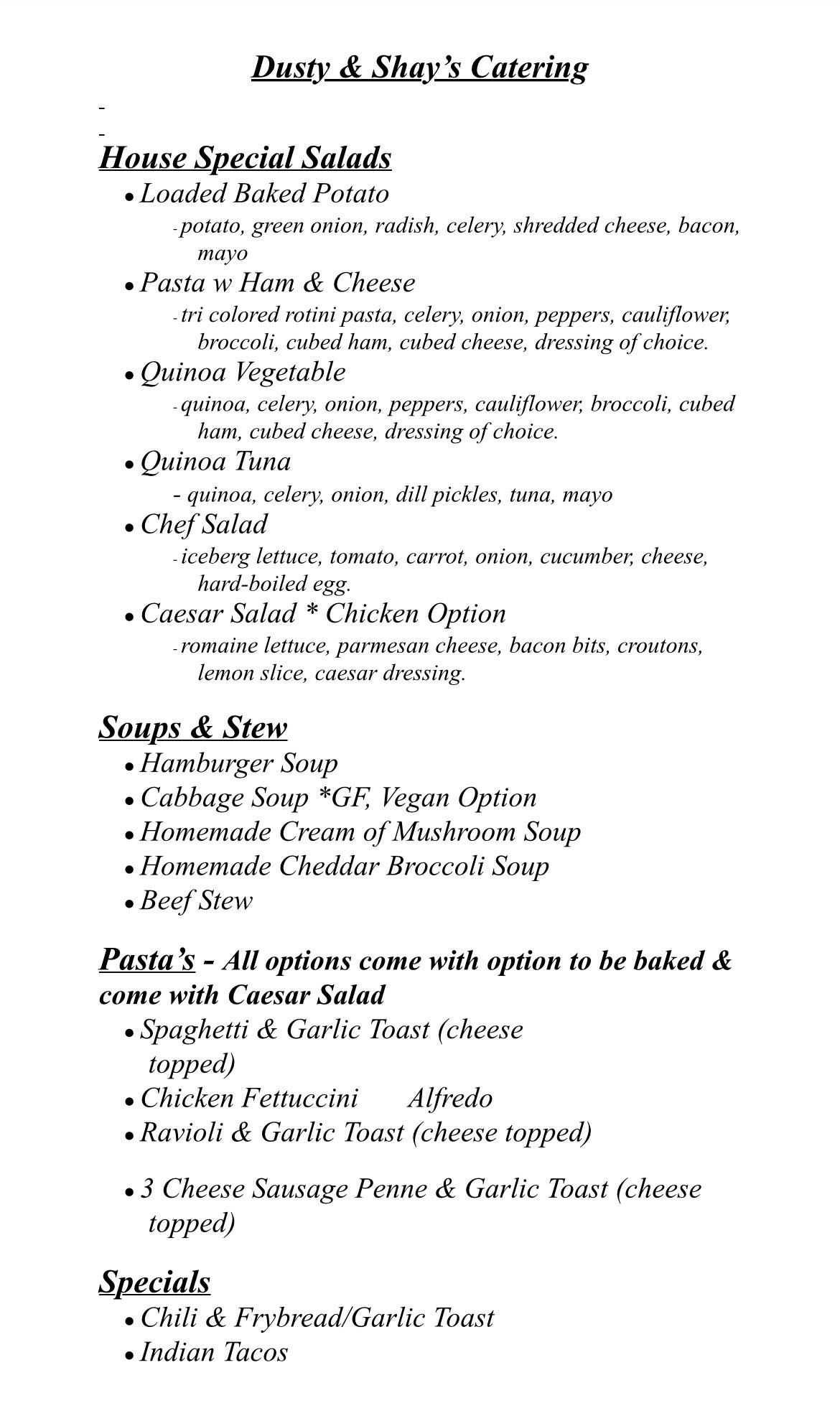 Shay and Dusty’s is a full service catering business based in Cranbrook with diverse and unique offerings. Choose from their standard menu, or request a custom menu based on your needs for breakfast, lunch, and dinner service.