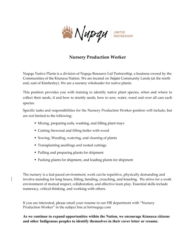 Nursery Production Worker Nupqu Native Plants is a division of Nupqu Resource Ltd Partnership, a business owned by the Communities of the Ktunaxa Nation.